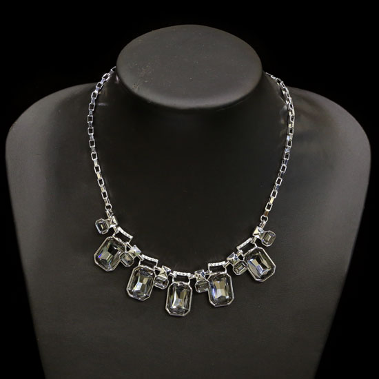 This crystal glass necklace features 5 pendants in emerald shapes. The crystal glass is carefully selected and polished for excellent light performance. It is easy to wear and match with your casual look.