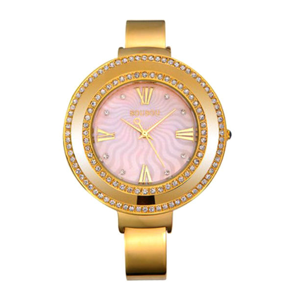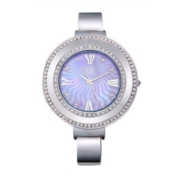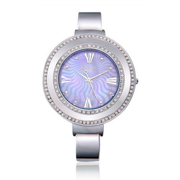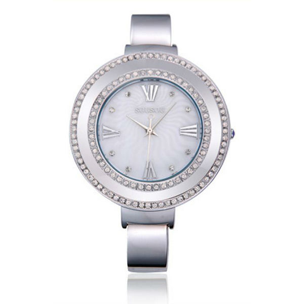 This eye-catching trendy quartz watch in sparkling tone is decorated with luxurious looking CZ crystals and high fashion designed bangle bracelet attaching to a jewelry clasp.