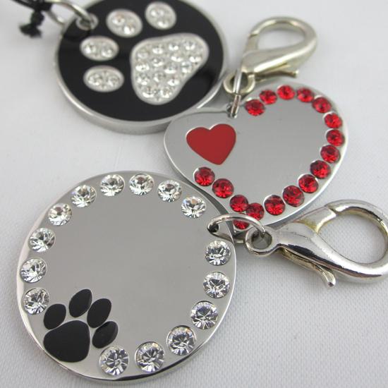 Displayed here is a stainless steel pet tag accented with sparkling Swarovski crystal for a touch of class. It features a lobster claw clasp for attaching to pet collar easily and conveniently. Charming and useful, this tag is excellent for engraving your pet's name.