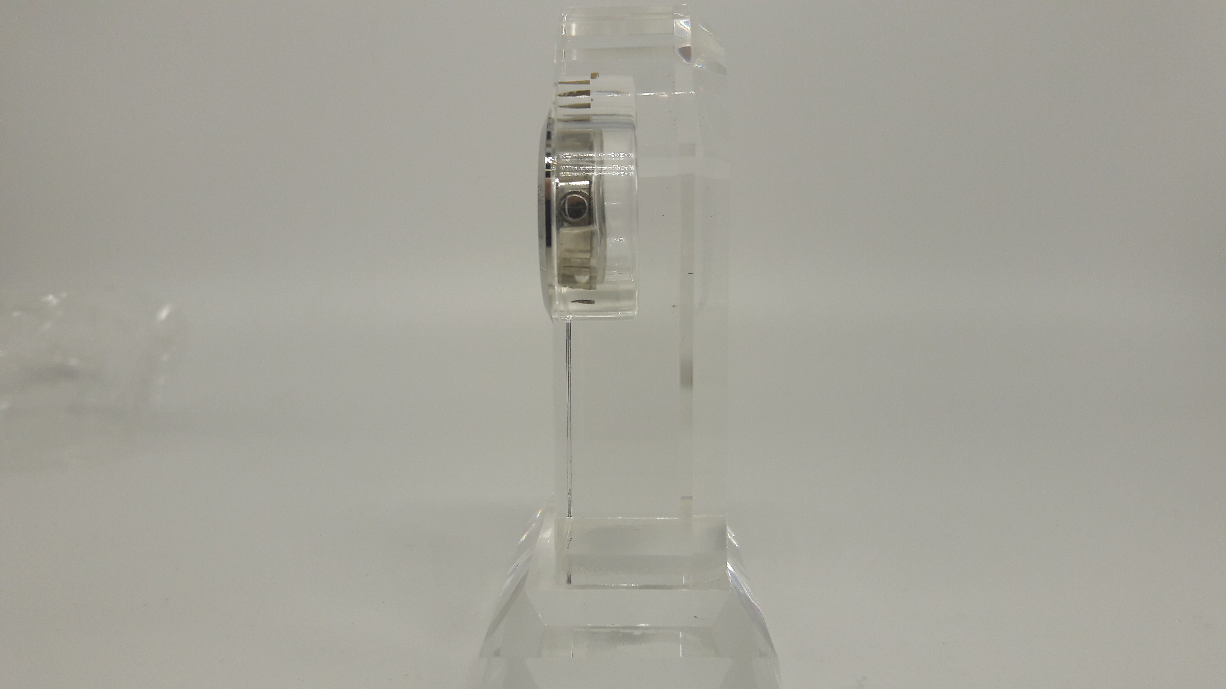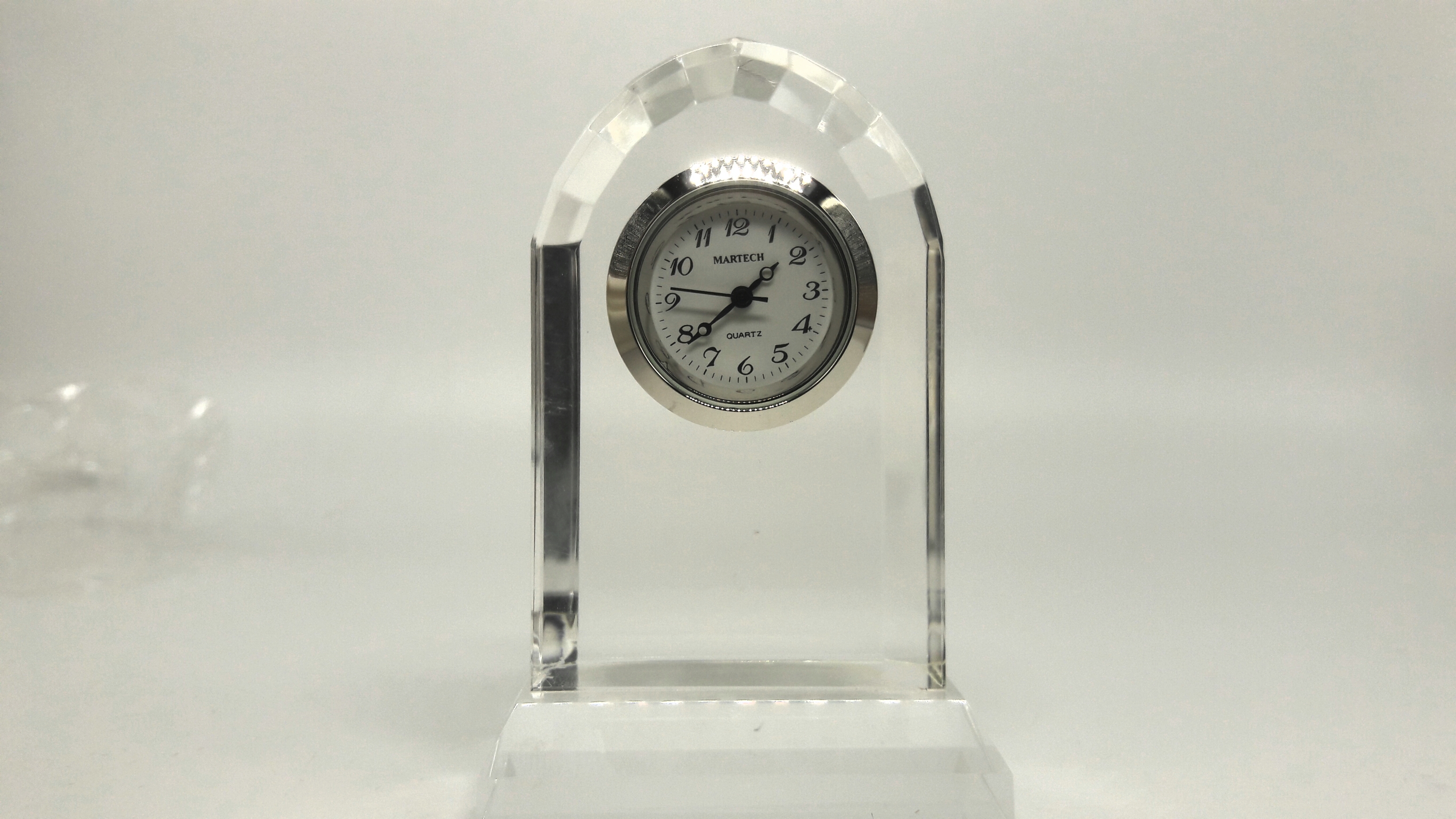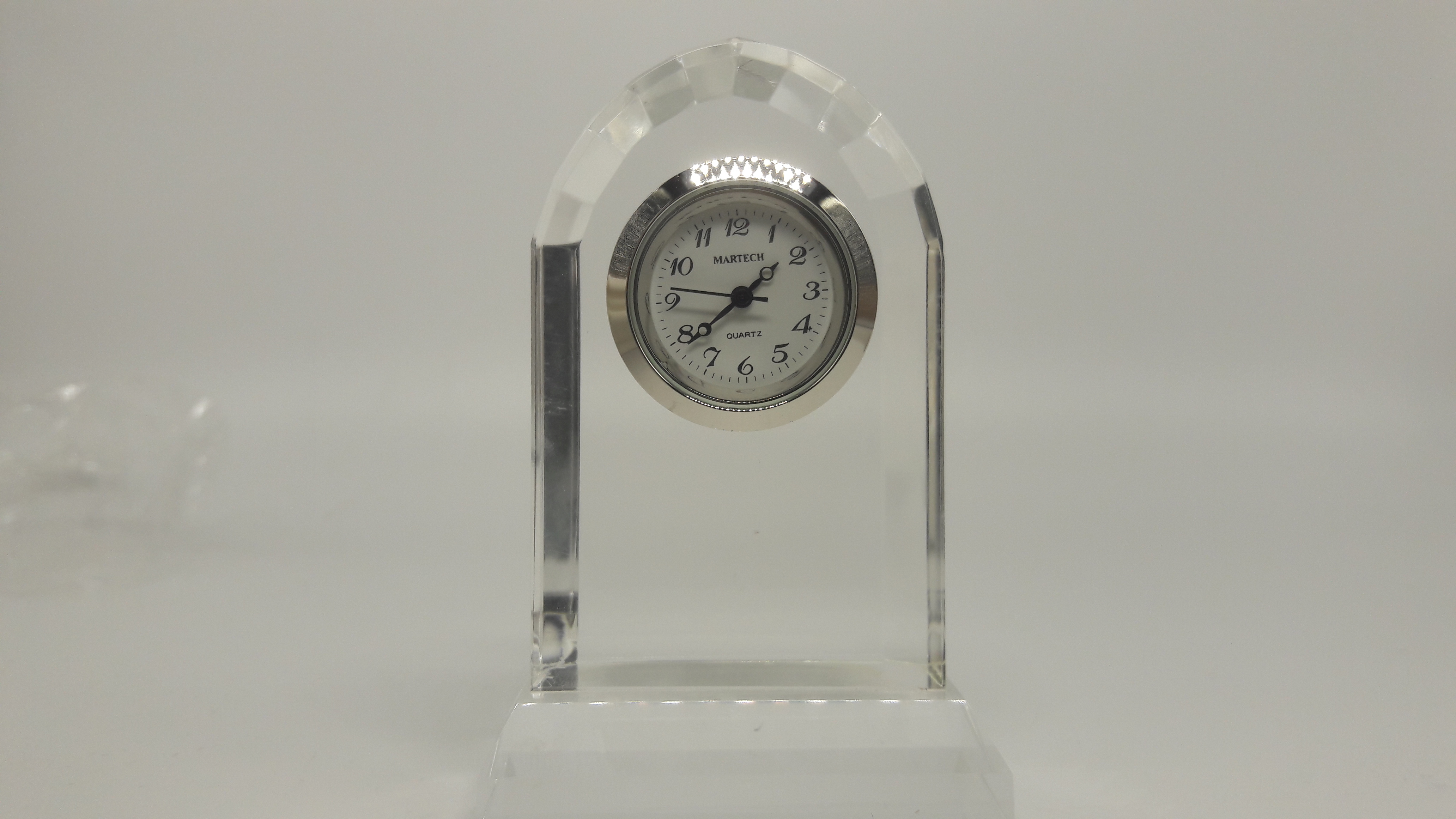 Crystal plaque ornament with a semi circular top, rectangular base. Analogue clock inlay on the front.