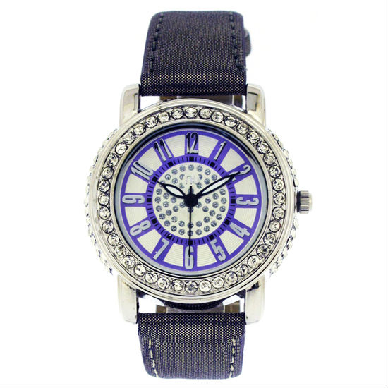 Metal alloy silver-colored case in round shape with crystal detailing.