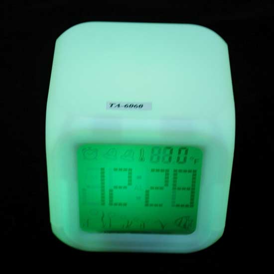 This adorable clock is characterized by its cube shape with round edges, making it more lovable. To match with its light green body, the backlit displaying screen is also a green one. The square clock looks splendid when the LED lights are turned on. Embellish your desk with this eye-catching clock.