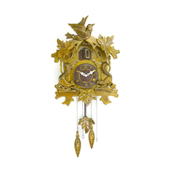 This is a wall clock with a sophisticated appearance in gold. It features a house-shaped casing with a vivid bird on top and exquisite details. This clock strikes the hours with a sound like a common cuckoo's call.