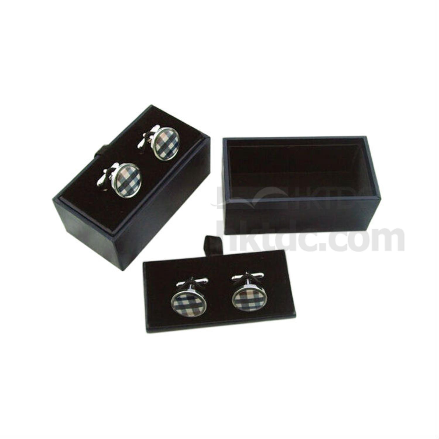 Plastic cufflinks boxes wrapped with paper and velvet inner.