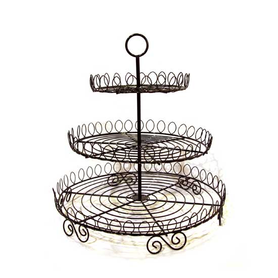 This is a cupcake stand with 3 round tiers. It is made with manipulated metal wire for a sophisticated and durable structure. The beaded and artistic feet allows it stand on any flat finish steadily.