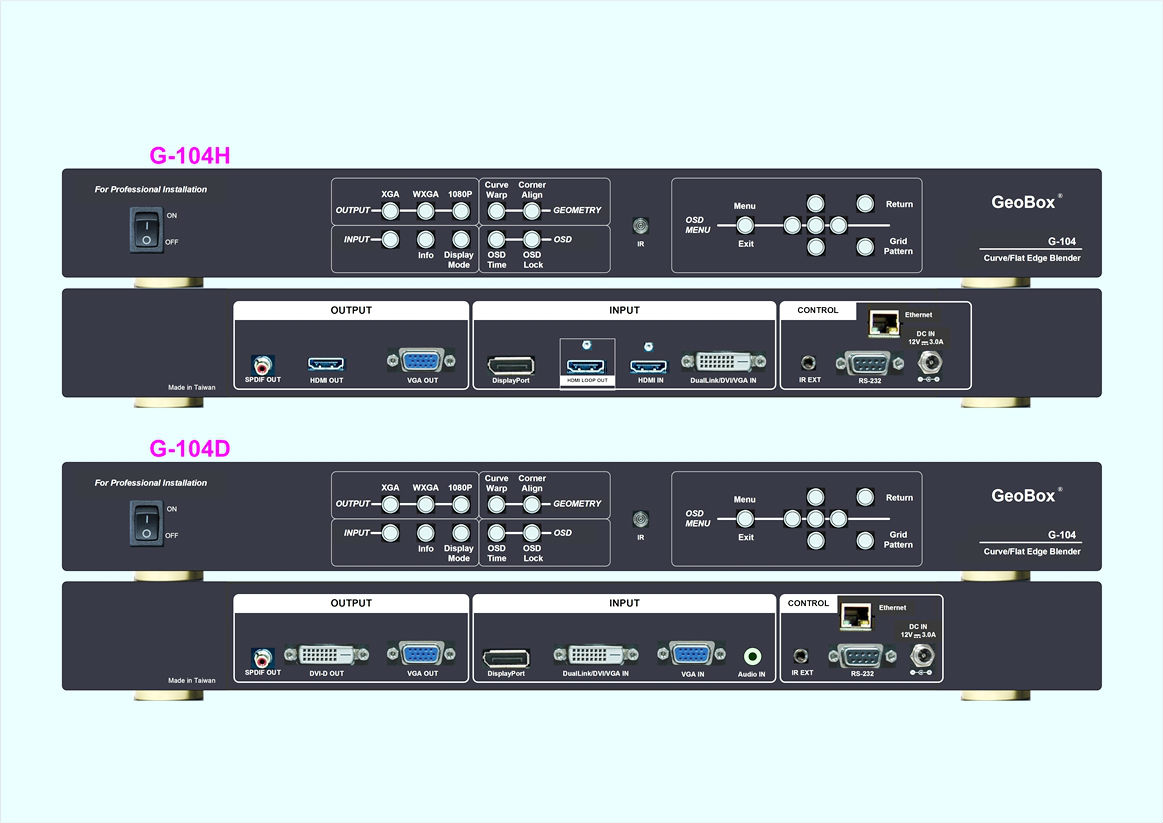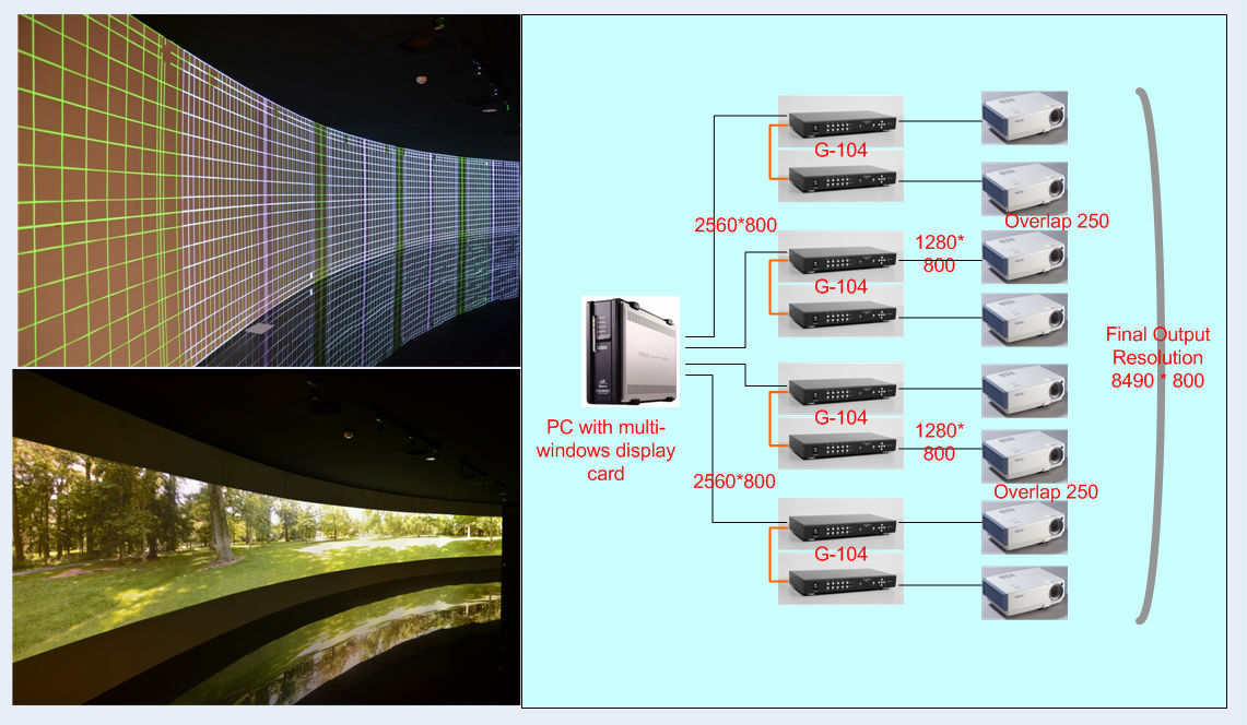 Featured here is a professional high performance single screen curved screen edge blending processor with HDMI interface and loop out port for daisy chain connection. It is designed with patented warp and edge blending technology similar to tier one projector makers with easy and friendly user interface. It's a standalone system supporting up to 4k/2k @30Hz 4:4:4 input without compression. With G-104, users can replace high end projector with low cost projector without lens shift, warp and edge blending. No PC, OS or special tool is required. It provides easy configuration, lower system cost, reliable and flexible solution.