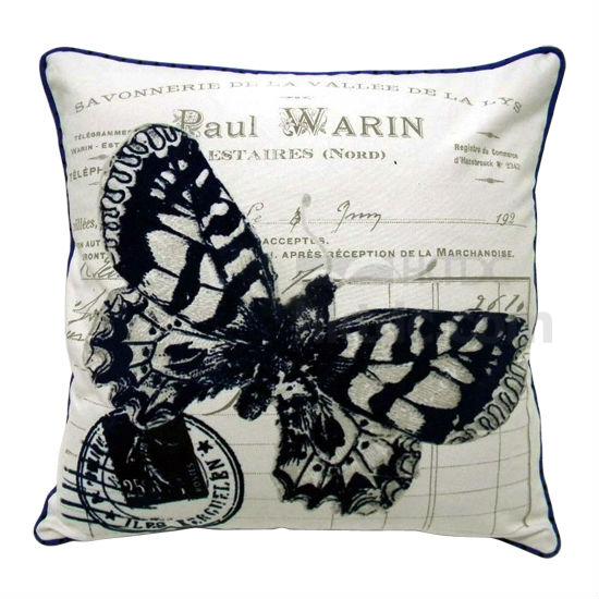 • Flocked cushion cover with customized butterfly French art and stamp accent.