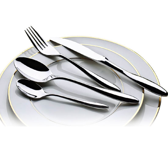 This cutlery set includes a tea spoon, a table spoon, a table knife and a table fork with a matching design. The robust stainless steel construction can withstand daily wear and tear. All the pieces are easy and convenient to clean.