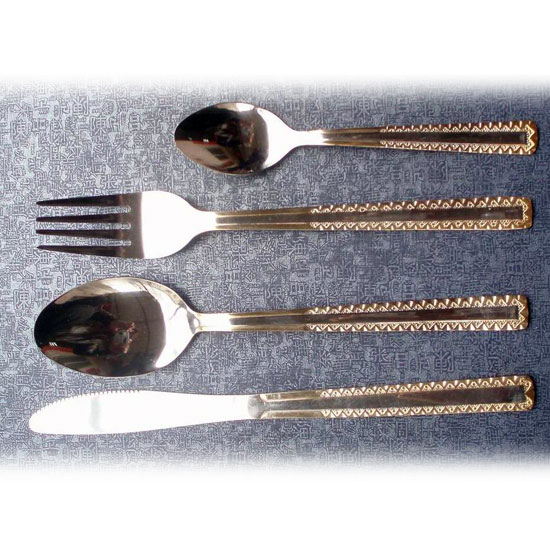 This is a set of gold plated cutlery featuring textured edges. It is plain and good-looking. It is carefully made for extra sturdiness and is durable.