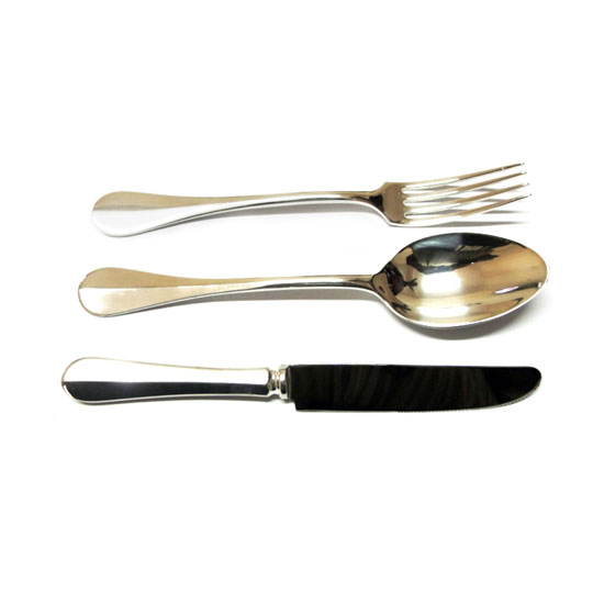 This is a cutlery set that includes a fork, a spoon and a knife with a matching design. The ergonomic handle allows a firm grip. This cutlery set is easy to clean and maintain.