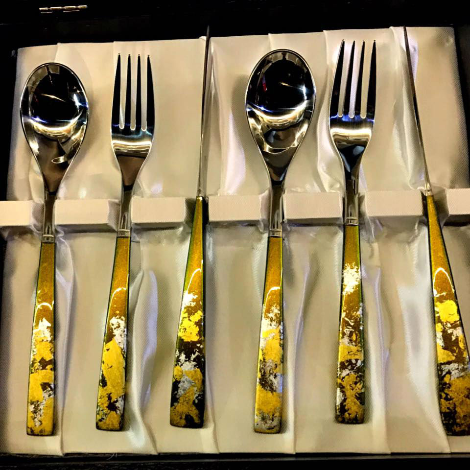 Indulge your meals in a golden splash of modern deluxe with this glass cutlery set. Steeping in high quality lacquer coating, it highlights an angular handle design for easy grab. The 6-piece gather is further boxed to make a wonderful present for any special occasions.