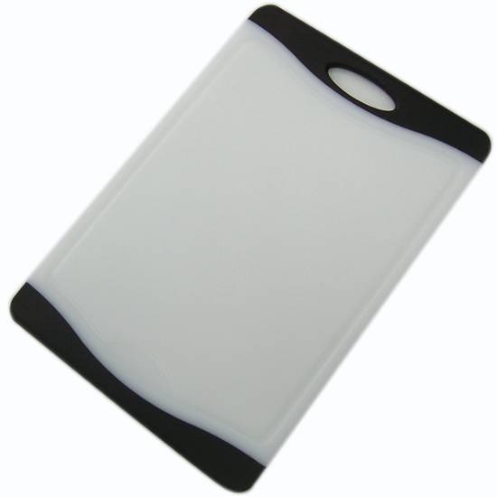 The cutting board bestows a plastic surface, which is easy to clean and less likely to have germs from raw food accumulated. The handle increases its portability around the kitchen. This lightweight cutting board with smooth edges is an unbeatable add-on to your kitchen.