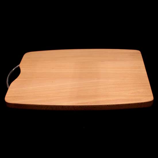 The cutting board is made of top-grade wood to provide a robust construction. It comes with a steel handle for convenient gripping and hanging up. This cutting board serves as an essential kitchen tool for every household.
