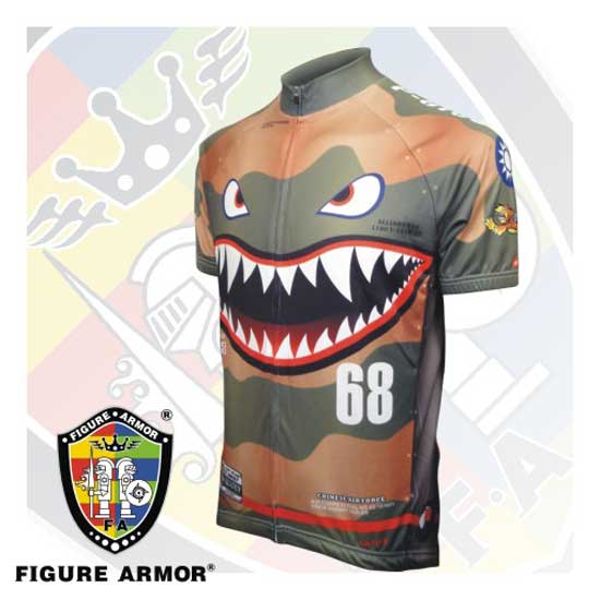 Displayed here is a cycling jersey with a tight-fit design for reducing air resistance. The polyester construction keeps the cyclist cool and comfortable. It is printed with a flying tiger pattern for added style.