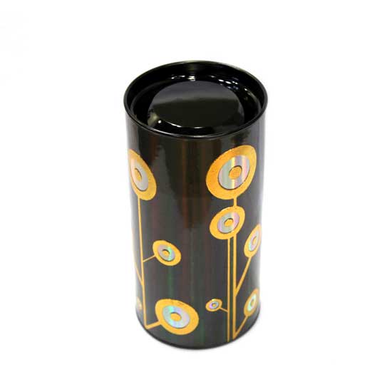 Displayed is a cylinder container that comes in a cool black color with yellow and silvery decorative circles. This container features a paper body with an iron cover for a convenient using experience. This cylinder container can be used to hold many daily objects.