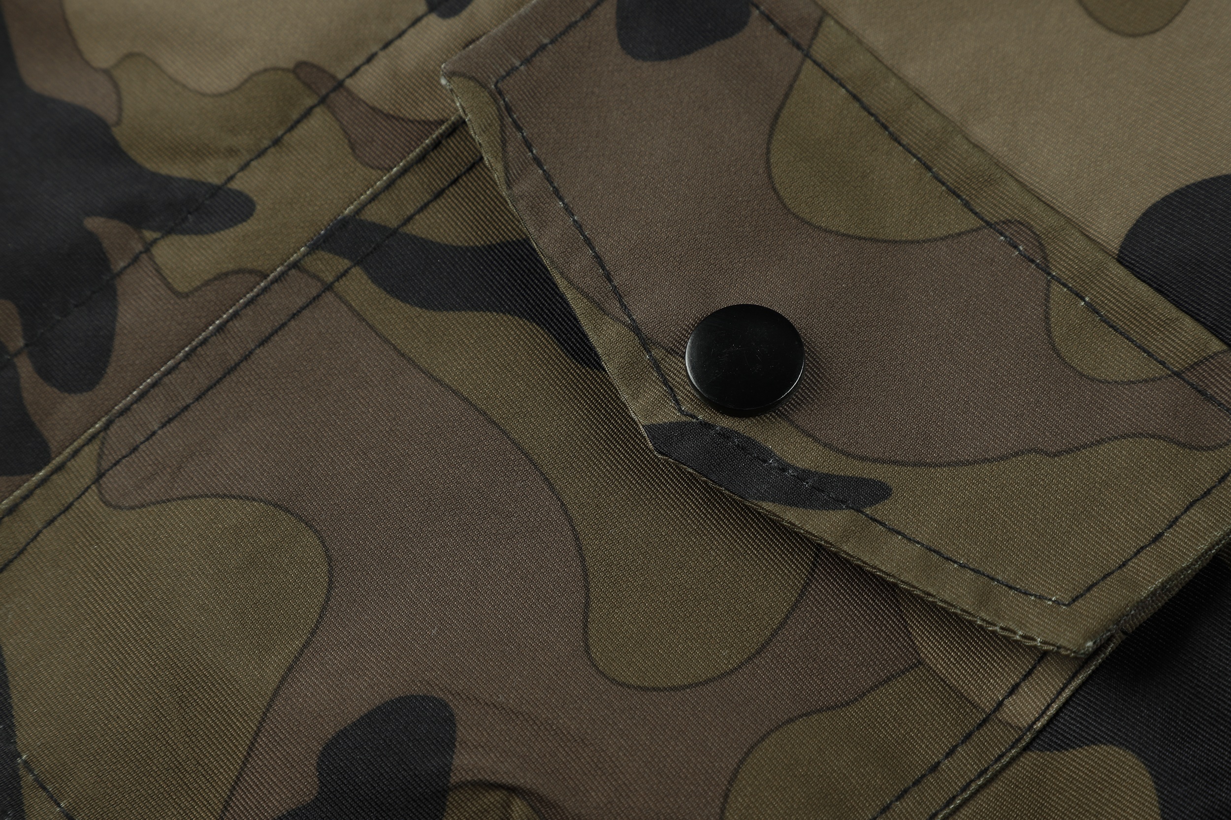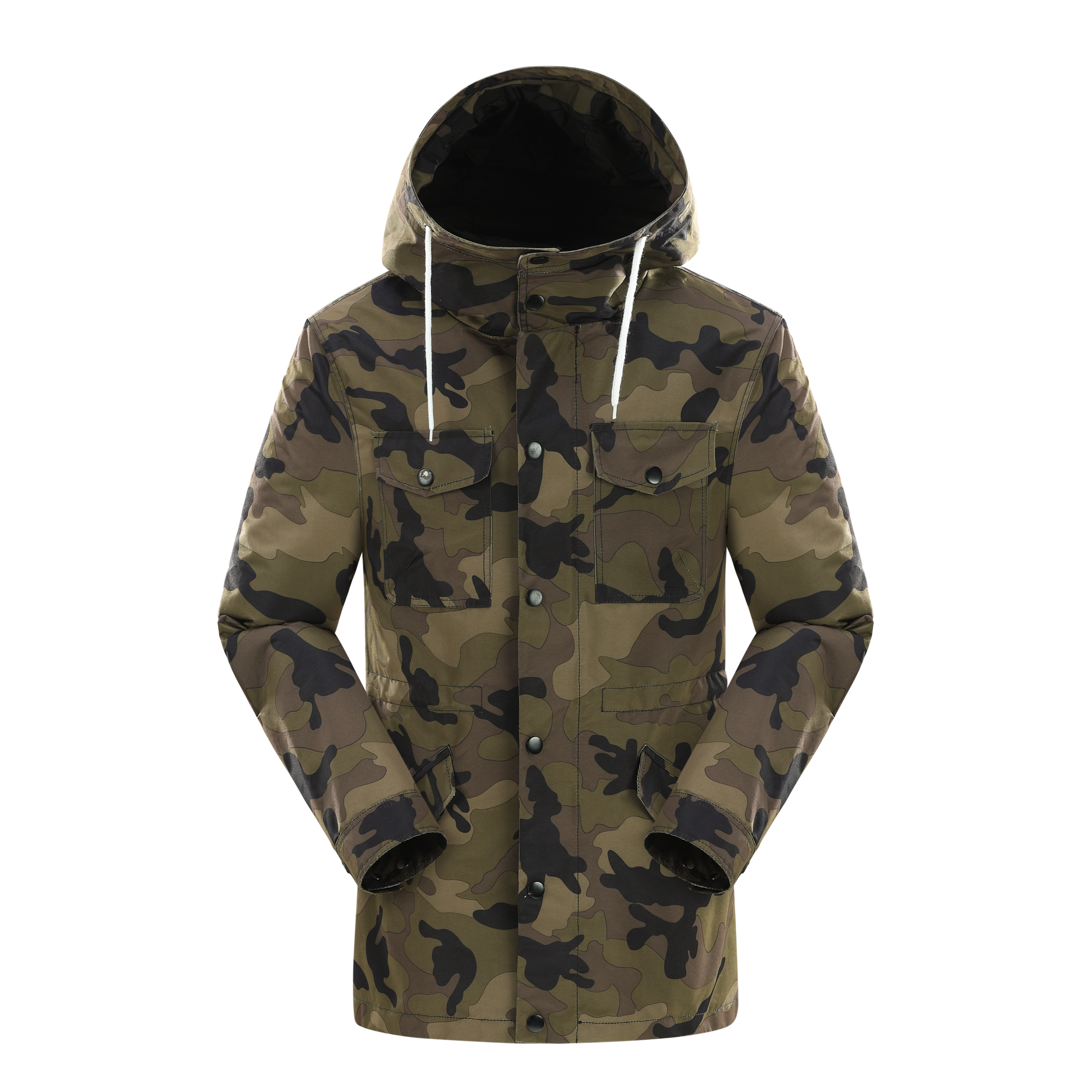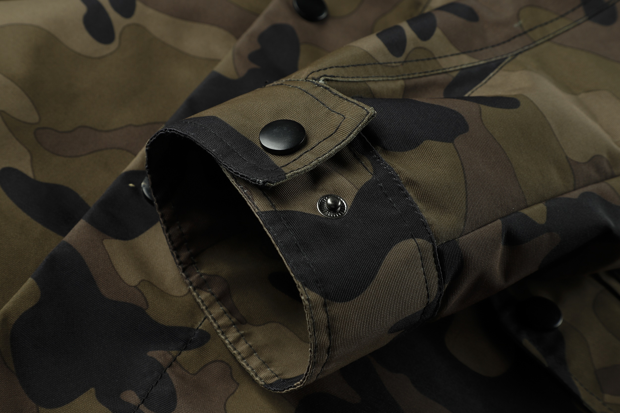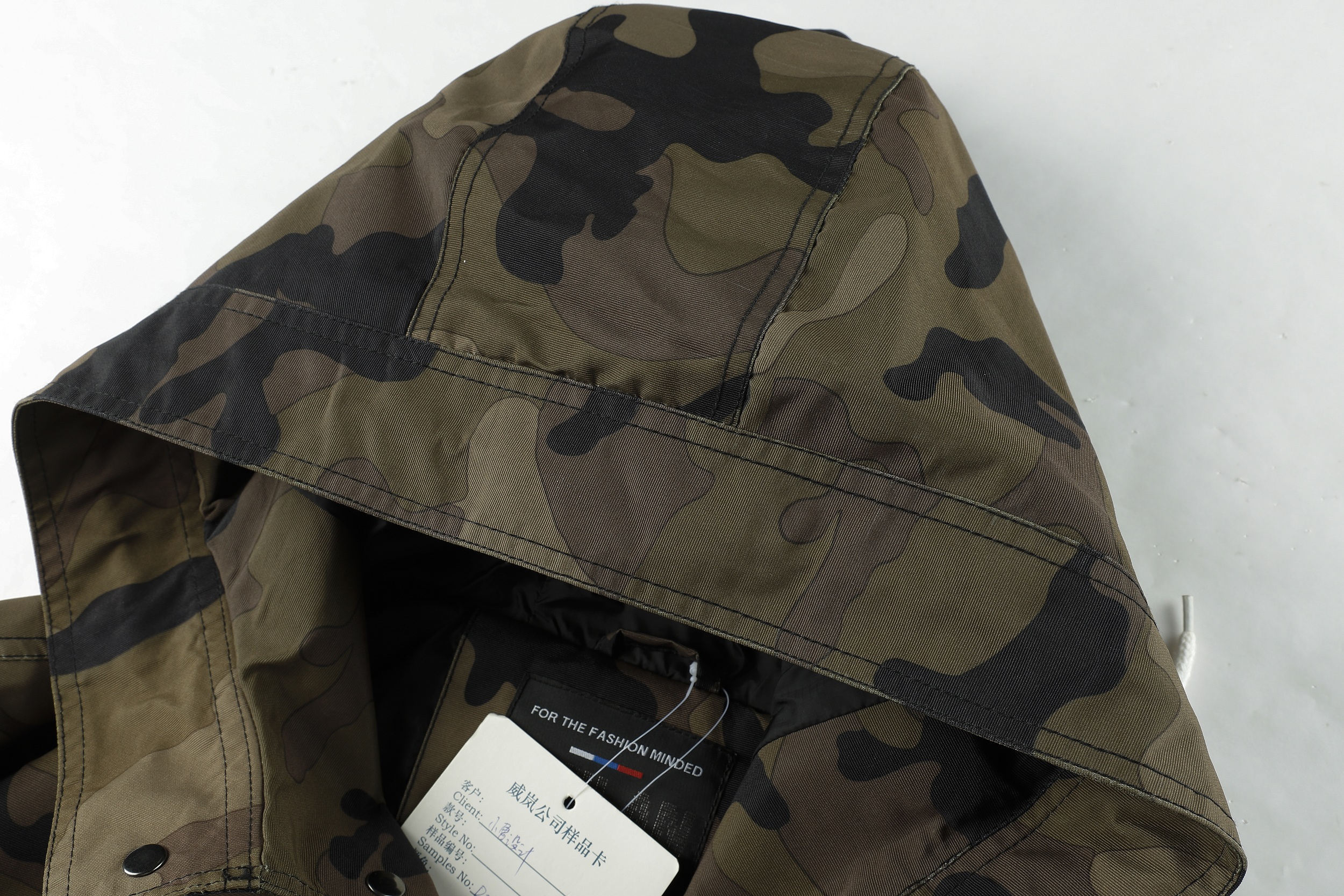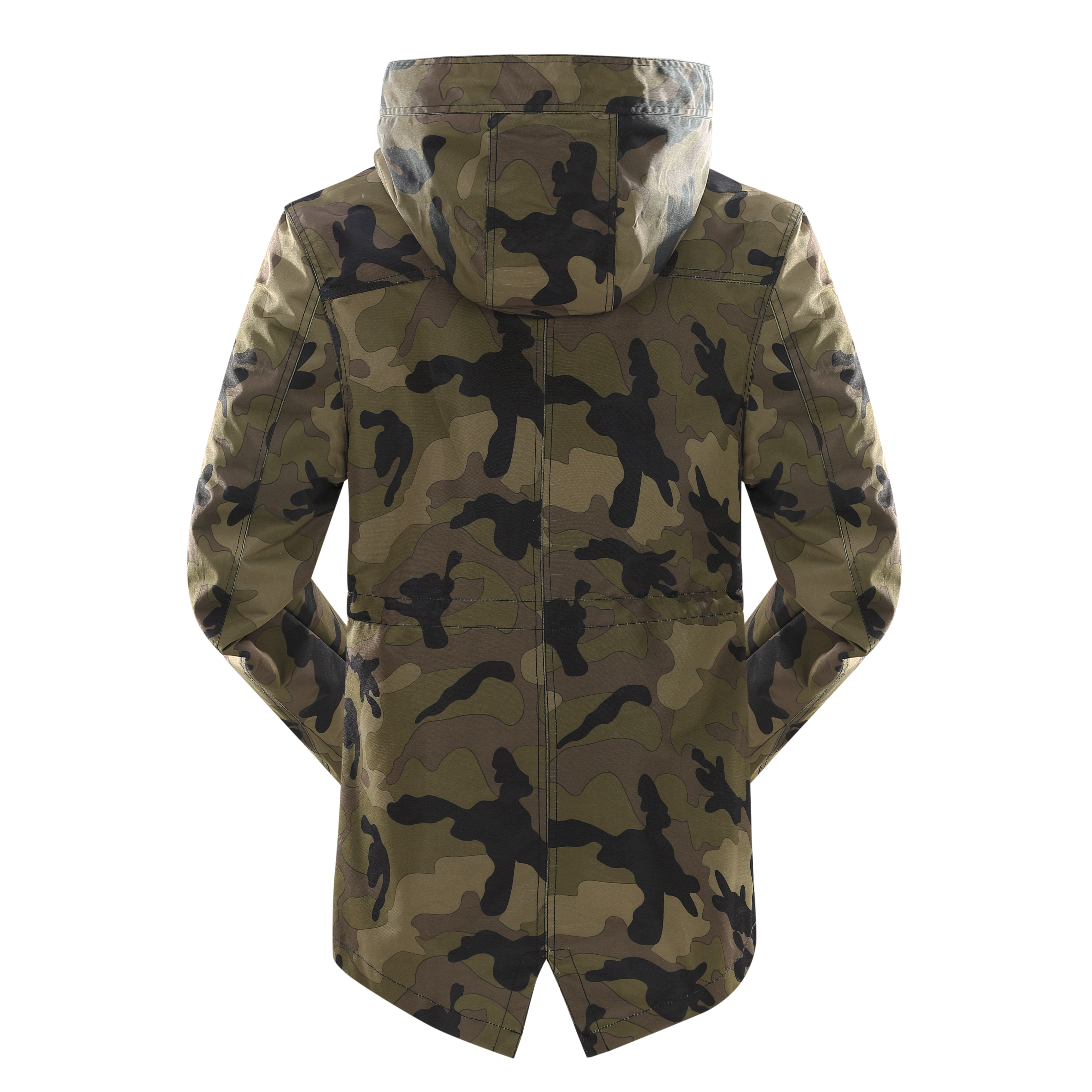 The image shows a digital interface displaying a camouflage jacket. The jacket features a classic military-style design with a hood and a front pocket. It is presented in a neutral color palette, blending shades of green, brown, and black for effective concealment in natural environments. The interface includes navigation options such as "AI search," "Web search," "Translate," and "Copy," suggesting a multifunctional platform. The background of the interface is white, with additional thumbnail images at the bottom, possibly offering different views or related products. The overall layout is clean and user-friendly, designed for easy browsing and selection.
