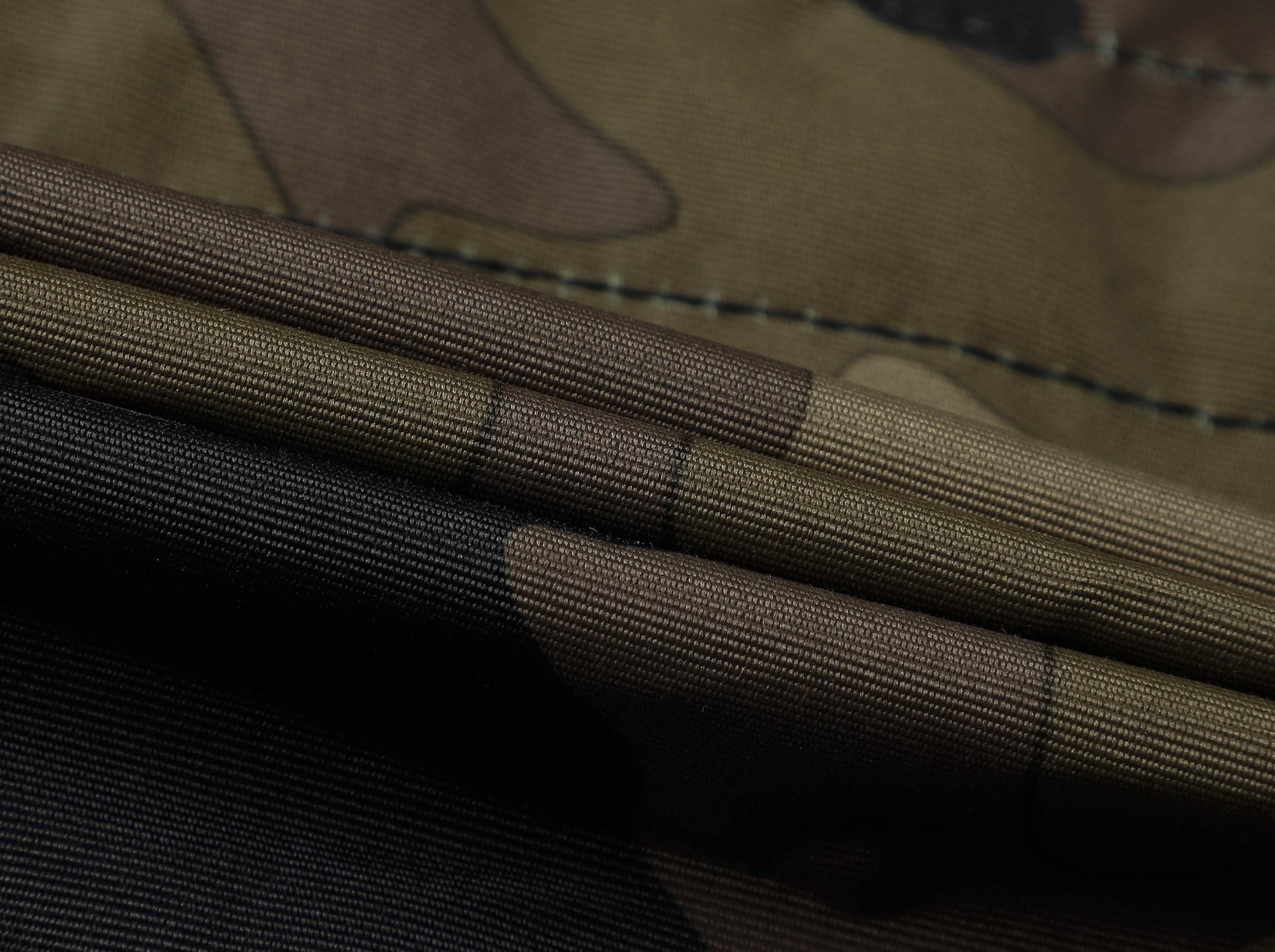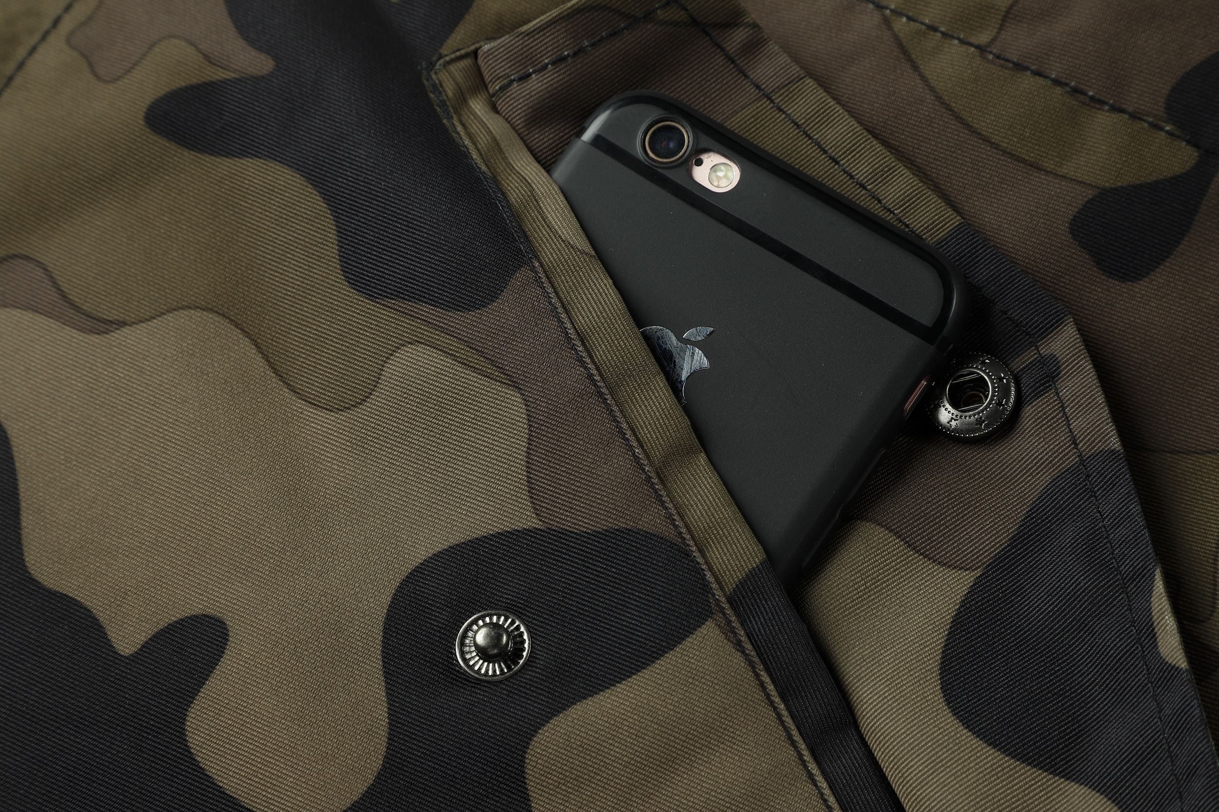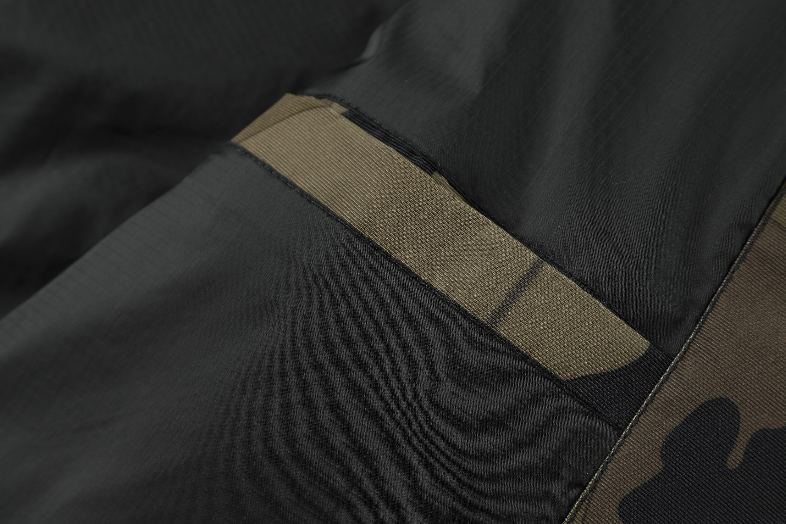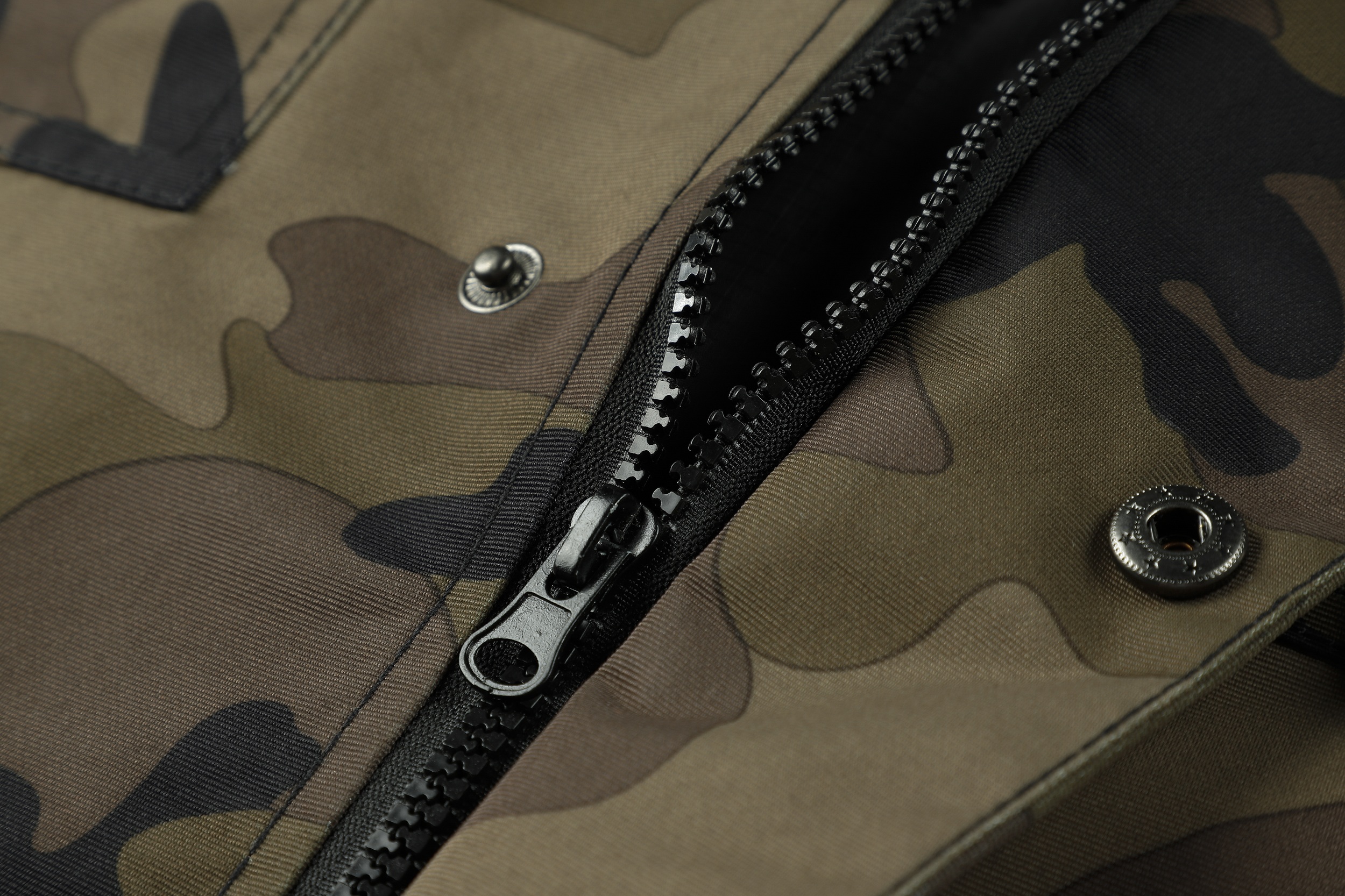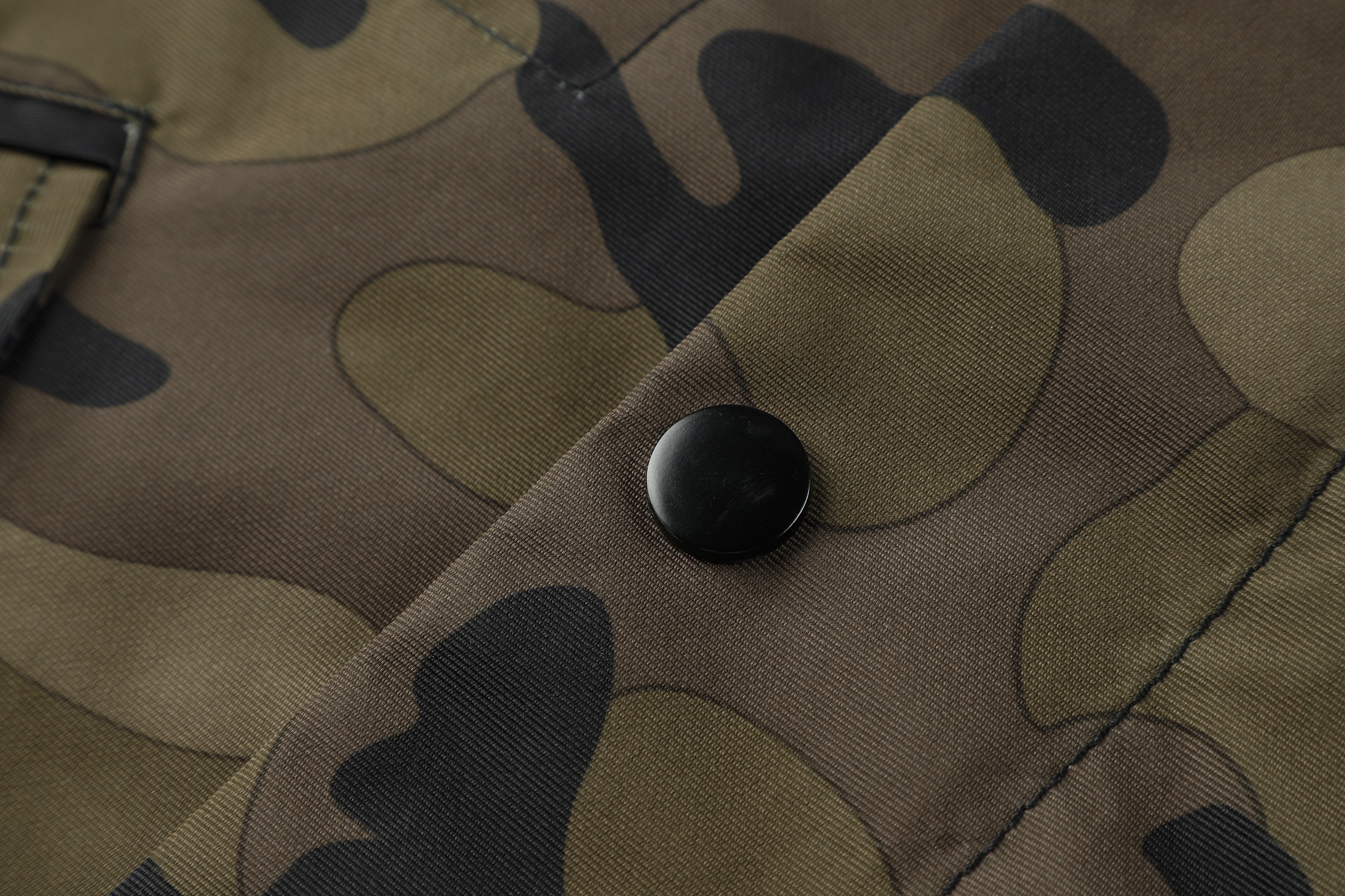 The image shows a digital interface displaying a camouflage jacket. The jacket features a classic military-style design with a hood and a front pocket. It is presented in a neutral color palette, blending shades of green, brown, and black for effective concealment in natural environments. The interface includes navigation options such as "AI search," "Web search," "Translate," and "Copy," suggesting a multifunctional platform. The background of the interface is white, with additional thumbnail images at the bottom, possibly offering different views or related products. The overall layout is clean and user-friendly, designed for easy browsing and selection.