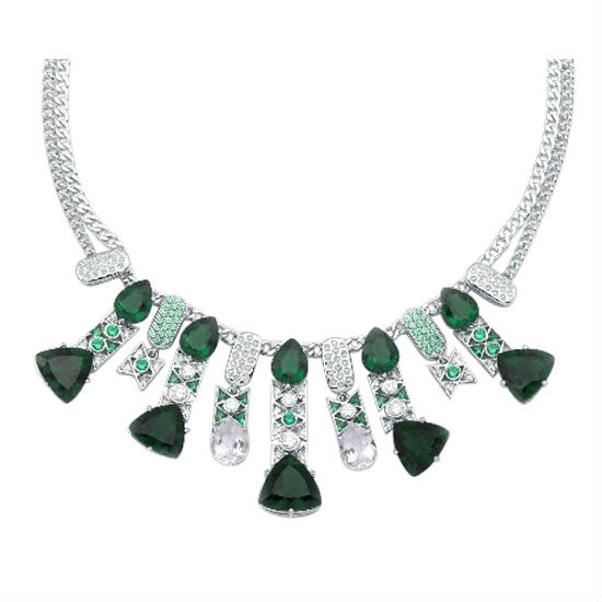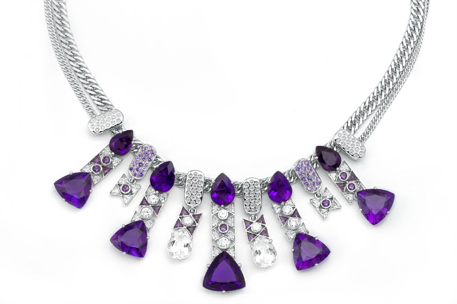 • Double chained magnificent necklace with suspending amethyst and diamonds provide an extra glamorous touch. This setting also comes in emerald and sapphire.