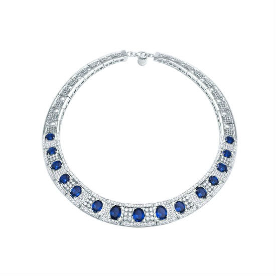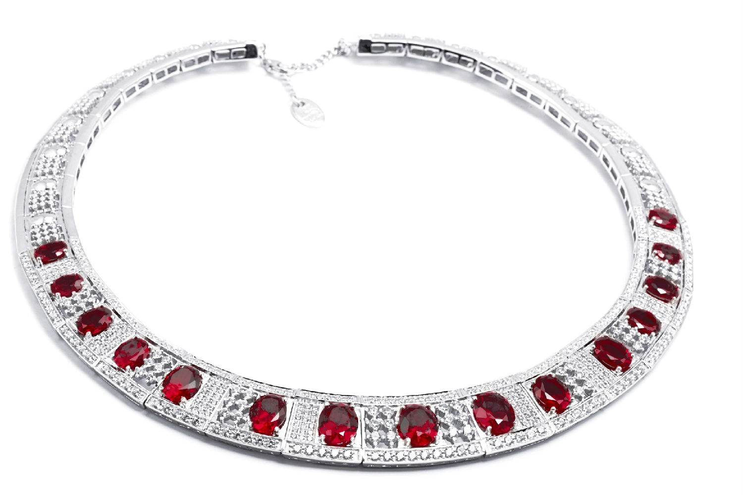 • An elaborate design, this fine silver choker style necklace can be worn comfortably with its channel setting of a repeated pattern of clawed set ruby’s textured plates and small clawed set diamonds. It comes on an extendable chain for the perfect fit. This setting also comes in sapphire and emerald.