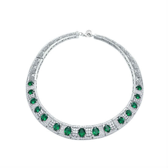 An elaborate design, this fine silver choker style necklace can be worn comfortably with its channel setting of a repeated pattern of clawed set ruby’s textured plates and small clawed set diamonds. It comes on an extendable chain for the perfect fit. This setting also comes in sapphire and emerald.