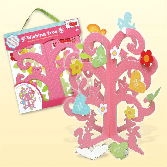 This paper craft set creates a beautiful tree decoration with ten heart-shaped wish tags which allow you to write wishes and personal messages. The paper craft tree features an all-over polka dot print with colorful floral and animal-shaped ornaments. Make your wish with this easy-to-make desktop decoration.