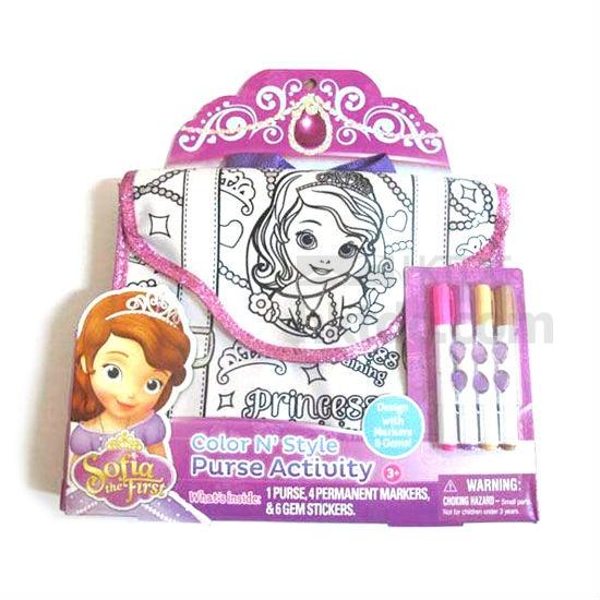 This product contains 1 purse, 4 permanent markers and 6 gem stickers. Children can color the purse with the markers to make their unique purse.