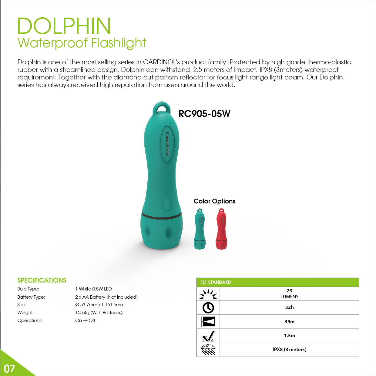 Dolphin is one of the most selling series in CARDINOL's product family. Protected by high grade thermo-plastic rubber with a streamlined design, Dolphin can withstand 2.5 meters of impact, IPX8 (3meters) waterproof requirement. Together with the diamond cut pattern reflector for focus light range light beam. Our Dolphin series has always received high reputation from users around the world.