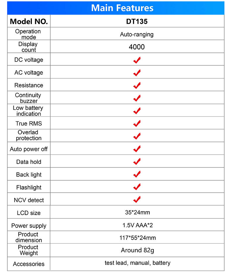 DT135 Smart Digital Multimeter with Smart Chip Design Backlight and NCV Testing