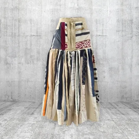 Gathered patchwork skirt with pocket, crafted with assorted fabrics, high-waisted fit, and bold color contrasts.