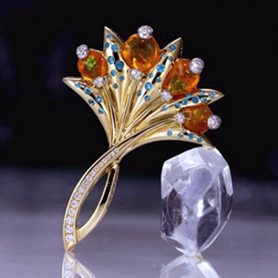 Round shape of orange gemstones at the top in between 2 silver white gemstones.