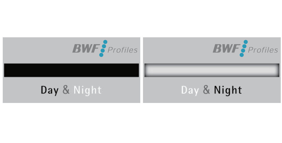 For the perfect Day & Night effect we recommend to install the plastic profile in a light sealed housing. The Day & Night colouration can be produced in the usual wall thicknesses.