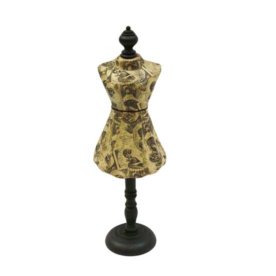 This compact decoration dummy features a dress shape with retro figurine patterns. It is constructed from paper mache for a unique touch. This delicate decoration dummy is a wonderful addition to your home or shop.