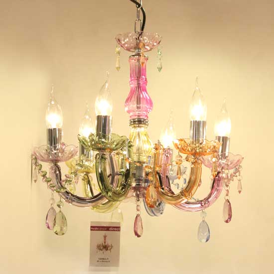 Showcased is a decorative chandelier in a multi-colored finish. The dangling prism offers added sparkle and elegance. Spice up your living room instantly with this graceful chandelier.