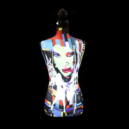 This decorative mannequin is made of quality materials for durability. It can be used as a hanger and a floor lamp for added functionality. This mannequin is designed with colorful prints for an eye-catching look.