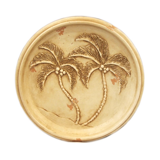 This round decorative plate is carved with embossed palm tree patterns with refined details. Crafted of earth clay, the plate is treated with a special vintage finish. Enhance your home decor with this tasteful decorative plate.