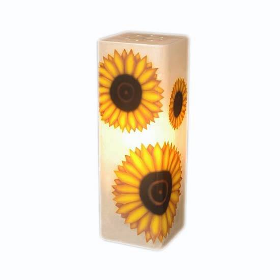 This is a table lamp in a contemporary design. The columnar lampshade and sunflower patterns showcase a touch of sophistication. This delicate table lamp makes a stylish way to add a splash of color to your home setting.
