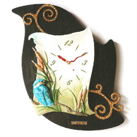 Featured is a leaf-shaped decorative wall clock designed with fancy detail. A vividly crafted kingfisher is portrayed in a background of weeds. The green dial markers and red clock hands looks natural and harmonious.