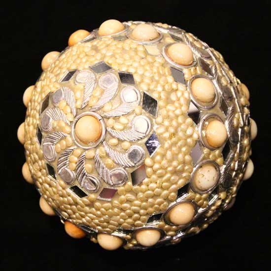The decorative ball is made of high-quality MDF and resin. It is decorated with shiny beads and silvery decorations for a touch of style. This ball makes a great household decorative item.