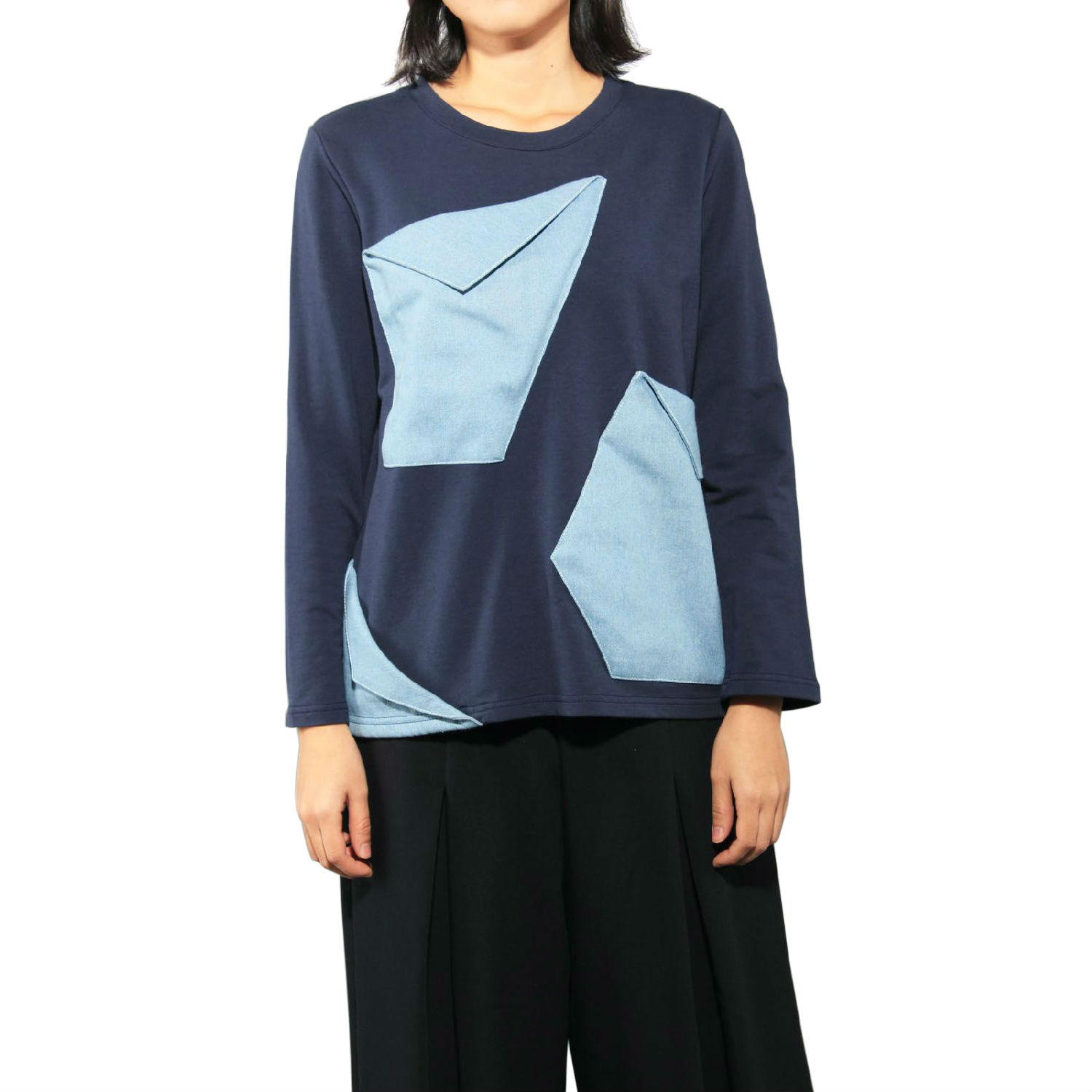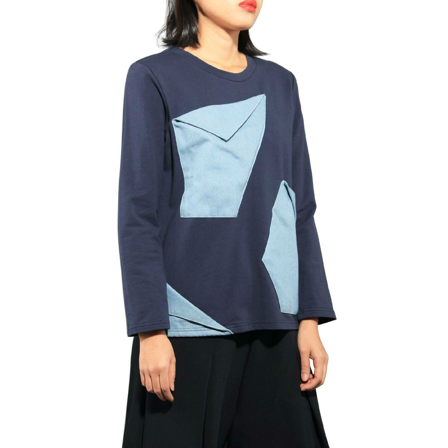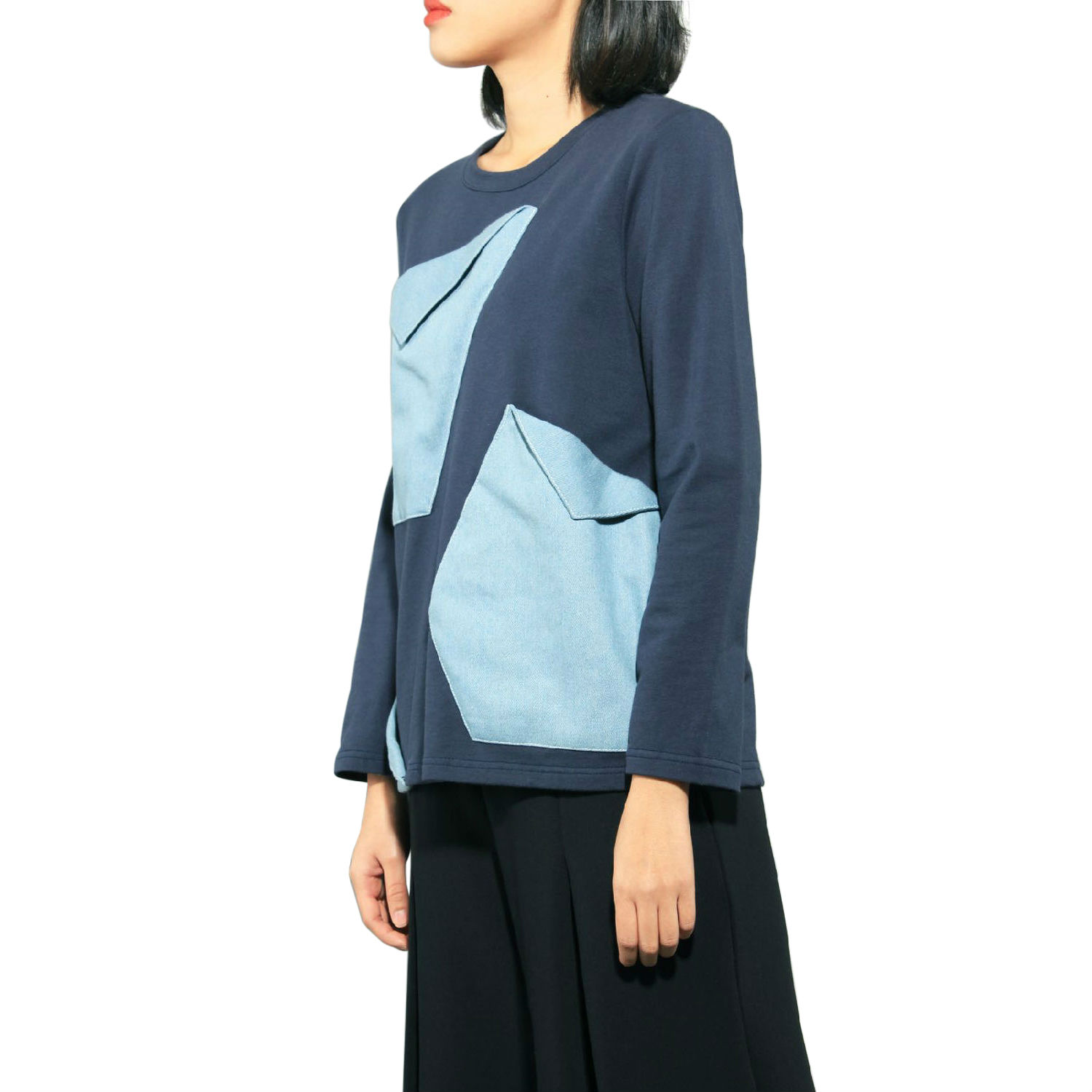 Simple and easy-to-match, this pullover top comes in a relaxed fit to complete your off-duty attire. Infused with denim elements with the large and asymmetric pockets adorned over the front panel, it realizes visual interest with an artistic touch to space up the monotone bodice. Pair it with your favorite jeans and sneakers for a stylish weekend-lounging look.