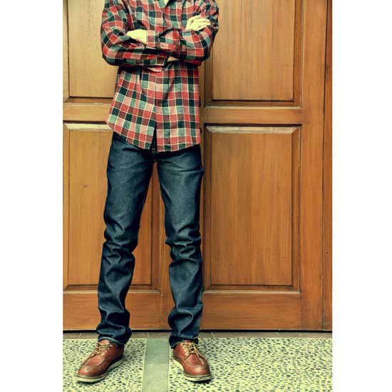 The denim trousers are completed with a fashionable slim cut. The solid indigo design makes it easy to mix and match. The jeans go perfect with a checked shirt and leather-made shoes.