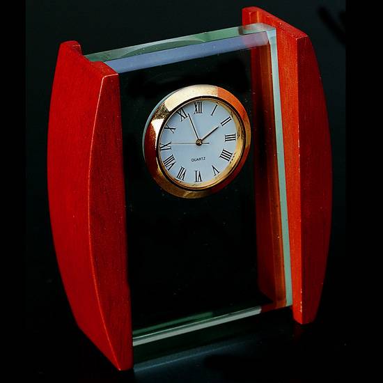This is a nice desk clock. The table clock is design in an elegant way with a blend of classical wood structure and modern acrylic body. The clock dial is in roman numerals with an attractive gold surface.