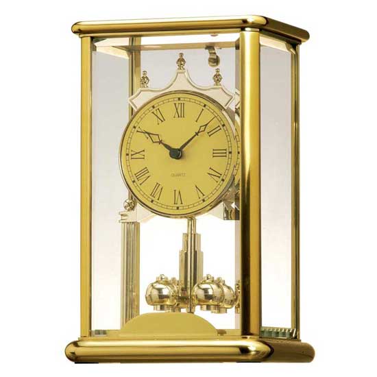 Presented here is a desk clock with a refined design. The clock is well designed with a metal and bevel glass housing for lasting durability. The dial is marked with Arabic numeral hour markers in a dainty way.