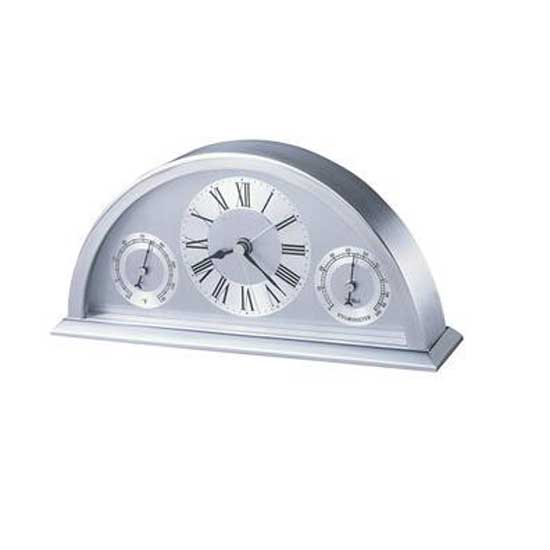 The semicircular metal clock combines contemporary flair with the additional function of a hygrometer and thermometer. The dials features circular, diamond-cut numeral rings with black Roman-numeral indexes and hour and minute hands. This metal clock comes with a full felt bottom to protect your tabletop.
