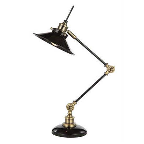This is a desk lamp with a retro and classic design. It features a durable structure in black with golden details for an elegant look. The arm is adjustable for added utility and convenience.