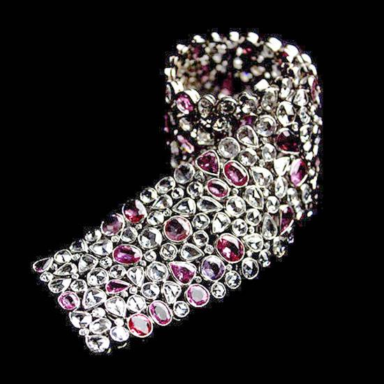 This is a diamond and sapphire bracelet for ladies and women. It is bezel-set with numerous rose-cut diamonds in heart, round and pear shapes. The pink sapphire scattered among the diamonds perfectly complement the glittering feature of the bracelet.