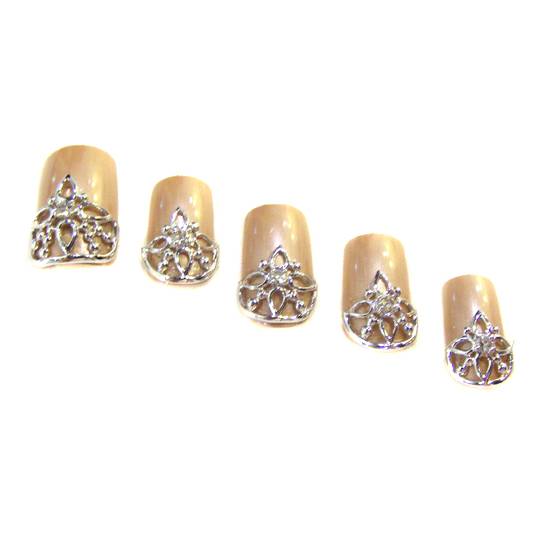 This is a set of five artificial finger nails with platinum and diamond decoration. Each plastic nail is painted gold and has a crown-like ornament in platinum set with one diamond in the centre. The five nails are in different sizes which can be ground to suit your nails perfectly.