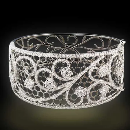 Displayed is a diamond bangle in an unmatched design. The thick band features neat hexagonal cutouts topped with curly strips set with dazzling diamonds for an impressive style. The bangle showcases fine polishing for added elegance.