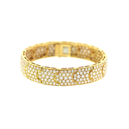 This is a fashionable bangle that is finely crafted of 18-karat yellow gold. The allover dazzling diamonds are well paved on the band. This fine jewelry is surely an ideal addition to your jewelry box.