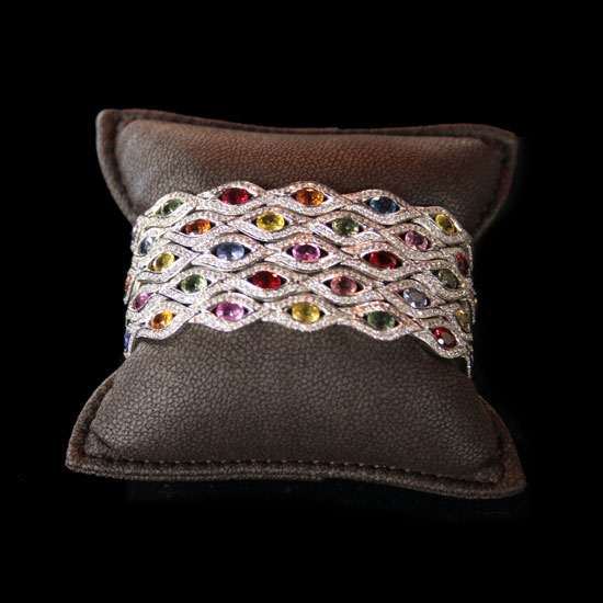 This bracelet appeals to people with its sparkling, deluxe and charming appearance. It is made of 18K white gold with dazzling diamond elements and colorful stone accents. This dainty bracelet is a great addition to your fine jewelry collection.