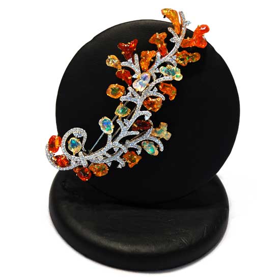 Displayed here is a brooch with 18K yellow and white gold. It is adorned with dazzling diamonds and lustrous opals. Add this diamond brooch to your jewelry collection.